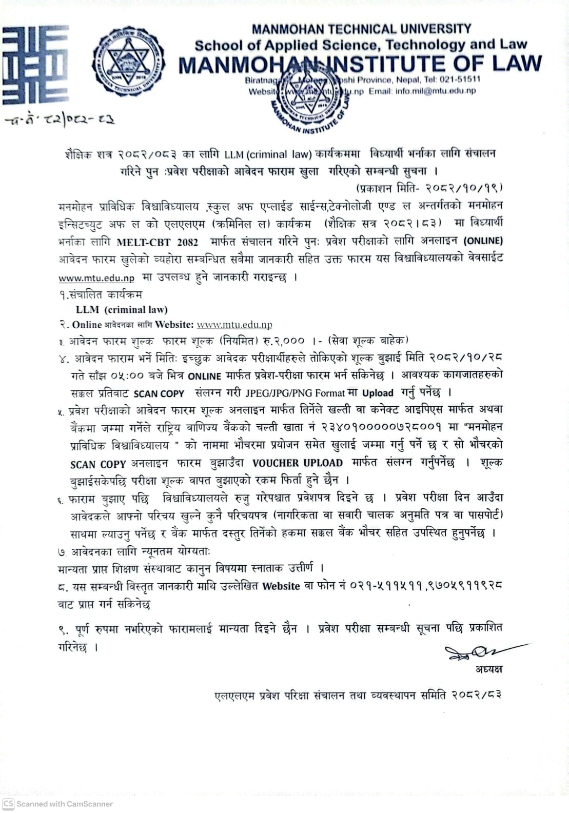 2082-10-19 (02 Feb 2026) - Re-Entrance Examination Notice for LLM (Criminal Law)